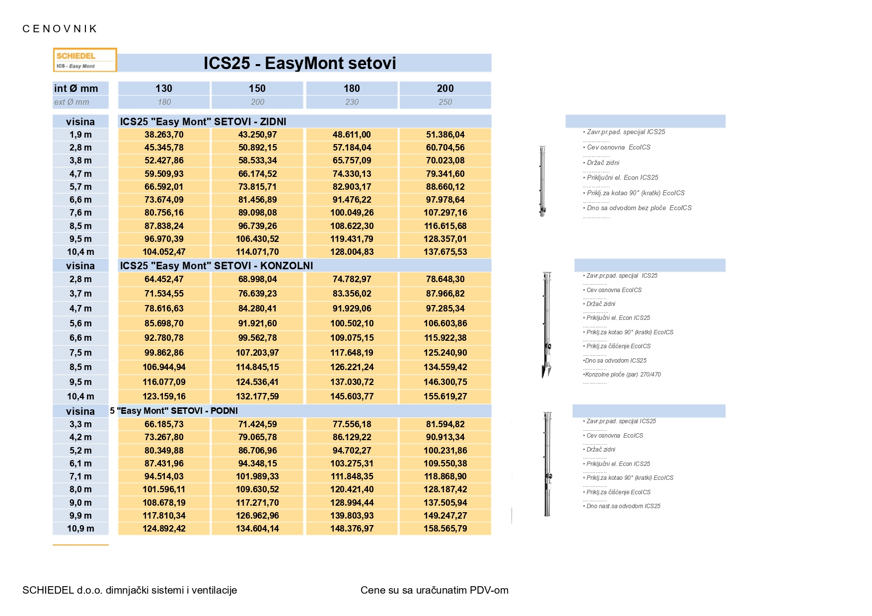 Aktuelne cene dimnjaka renomiranog nemačkog proizvođača Schiedel navedene po modelima i sa detaljnim karakteristikama uključujući PDV: